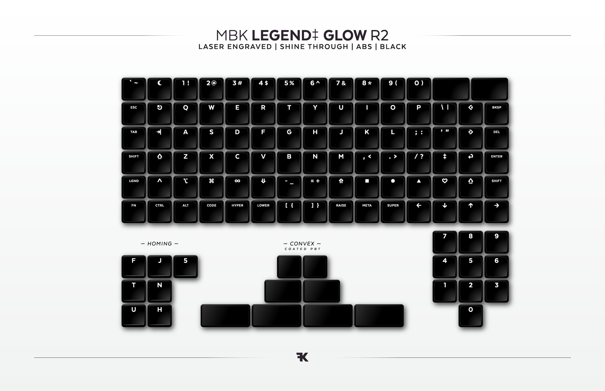 Black laser etched per-key LED keycap set; yep, the legend will glow! Everything you need for a full, x-%, or split keyboard. Includes homing keys for various keyboard layouts like QWERTY, COLEMAK, DVORAK, and your Numpad.